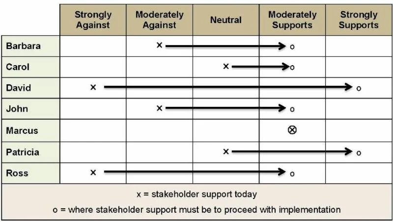 After assigning a rating to the quality of the solution, determine the stakeholder acceptance. Use a "Stakeholder Analysis Chart" and meet with your stakeholders to determine their support. Plot where they are today and where you need them to be. The "in between" is the area of resistance that you need to help your stakeholders overcome. Here is a sample chart: